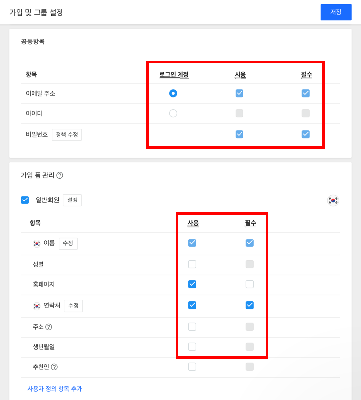 1. 가입 및 그룹 설정에서 엑셀에 추가할 회원 정보 항목을 사용으로 선택합니다. 상세한 설정방법은