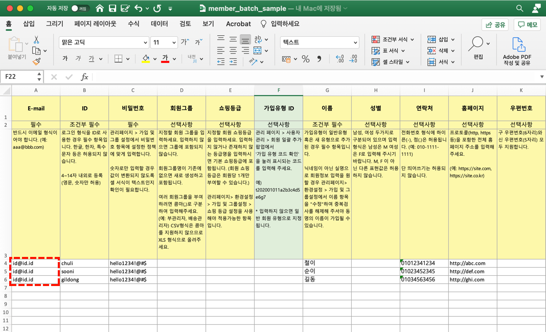 2. 가입 항목에 이메일을 필수로 사용하지 않아도, 엑셀에는 이메일을 필수로 추가해야 합니다. 회원의 이메일 주소가 없는 경우, E-mail 열에 id@id.id 를 공통으로 입력할 수 있습니다.