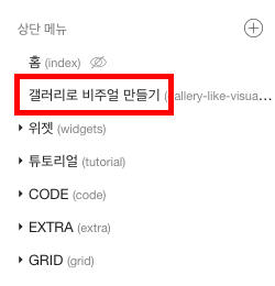 갤러리 위젯을 추가할 메뉴를 클릭해 이동하거나, ⨁ 아이콘을 클릭해 새로운 메뉴를 생성합니다
