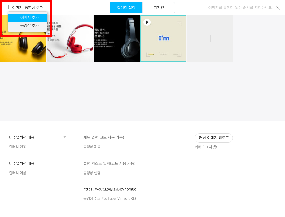 이미지 추가 또는 동영상 추가를 클릭해, 준비한 이미지를 올려줍니다. 동영상의 경우, 유튜브 또는 비메오에 올린 동영상의 URL을 입력합니다.