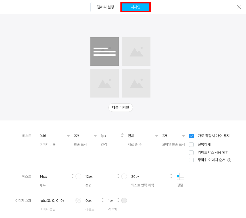 (선택 사항) 갤러리 설정 창 상단의 디자인 탭을 클릭해 이미지 비율, 한 줄 표시, 간격 등 옵션을 변경해 갤러리 모양을 편집합니다.