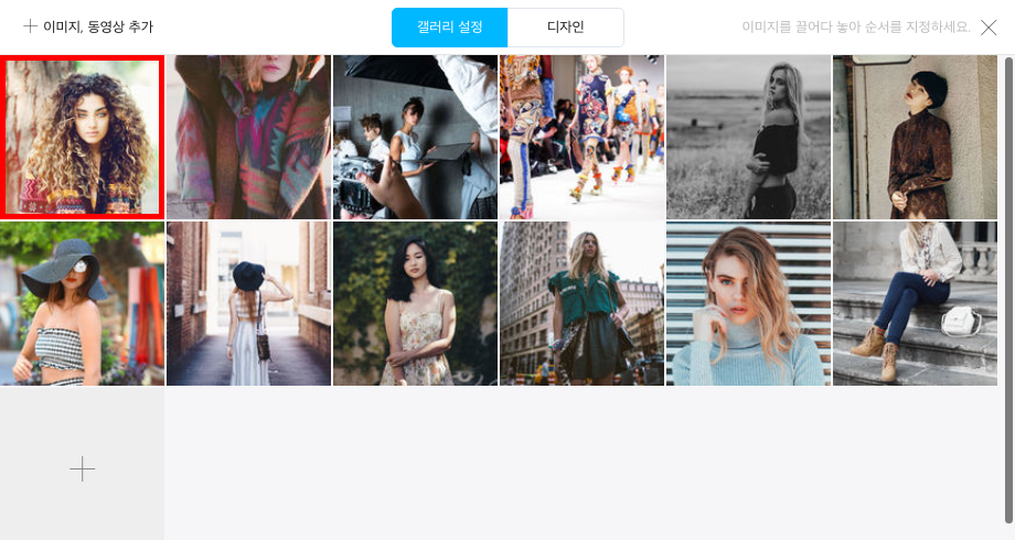갤러리 설정 창 왼쪽 상단의 + 이미지, 동영상 추가 에 마우스 포인터를 올립니다.