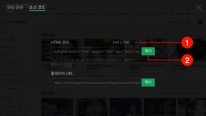 네이버 동영상 주소가 포함된 HTML 소스 코드가 복사 완료됩니다.