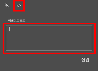 임베디드 코드 아이콘을 클릭하고, 복사한 동영상 소스 코드를 키보드 단축키(CTRL+V) 사용해 붙여넣습니다.