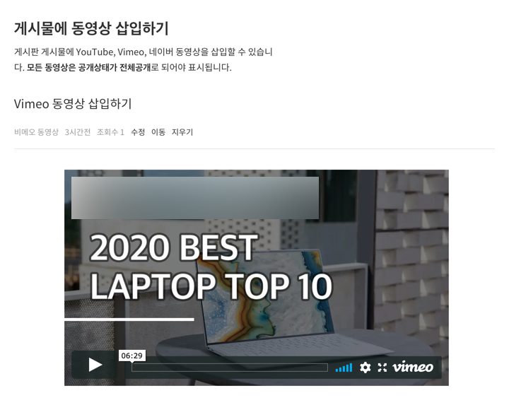 게시판 게시물에 YouTube(유튜브), Vimeo(비메오) 동영상을 삽입할 수 있습니다. YouTube 및 Vimeo 동영상 주소(URL)을 가져오는 방법은 이 도움말 하단의 설명을 참고해 주세요.