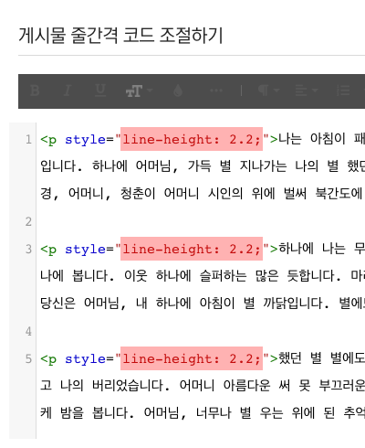 이 도움말에서는 게시물 텍스트 에디터를 코드뷰로 전환하여 CSS 스타일을 추가해 텍스트 간격을 조절하는 방법을 설명합니다.
