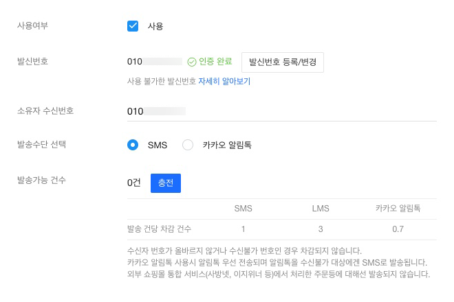 참고: 카카오 알림톡 사용 시 알림톡이 우선 발송되며, 알림톡 수신불가 대상에겐 SMS로 발송됩니다. 외부 쇼핑몰 통합 서비스(사방넷, 이지위너 등)에서 처리한 주문등에 대해선 발송되지 않습니다.