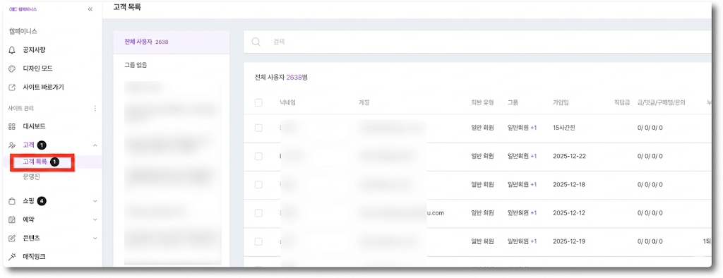사이트에 가입한 회원 목록이 표시되며, 회원 조회부터 추가, 수정, 삭제할 수 있습니다. 필요한 경우 회원을 그룹으로 묶어 관리할 수도 있습니다.