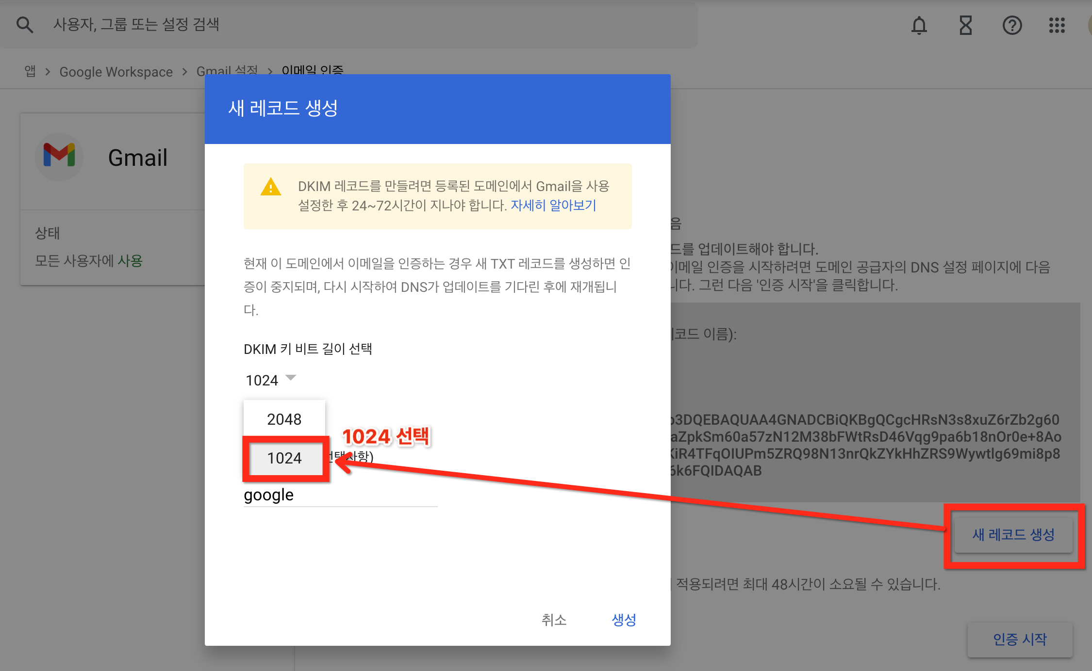 새 레코드 생성 상자에서 DKIM 키 설정 1,024를 선택합니다.