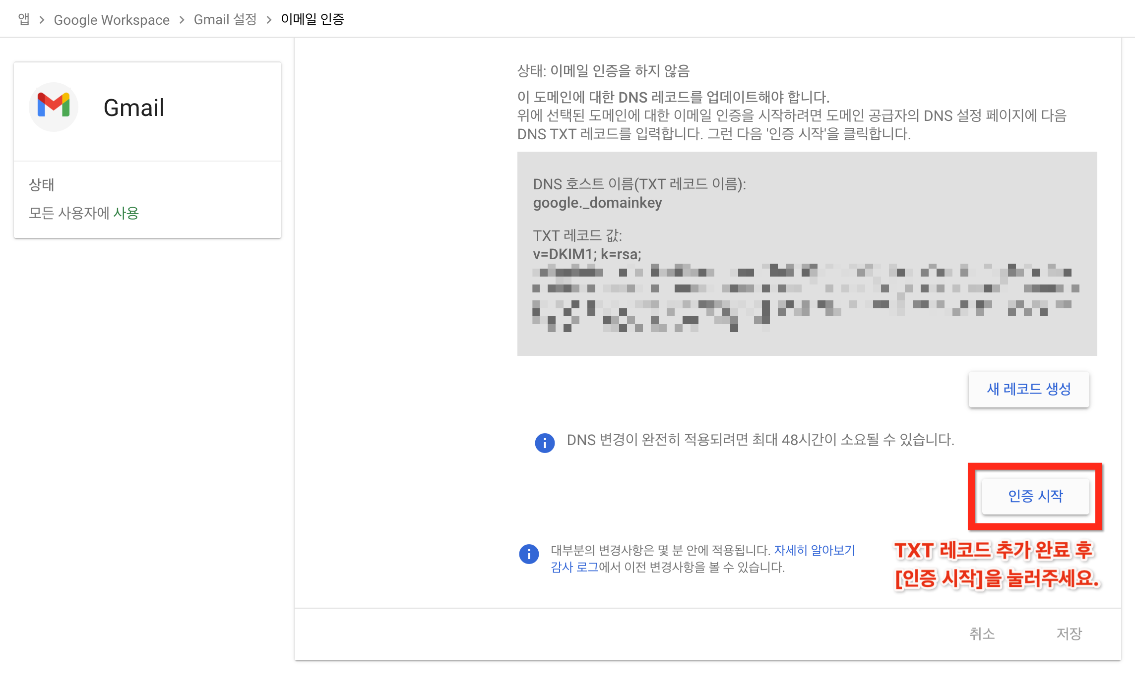 중요: Google 관리 콘솔의 이메일 인증 페이지에 이 도메인의 DNS 레코드를 업데이트해야 합니다라는 메시지가 최대 48시간 동안 계속 표시될 수 있습니다. 도메인 공급업체에서 DKIM 키를 올바르게 추가했다면 이 메시지를 무시하세요.