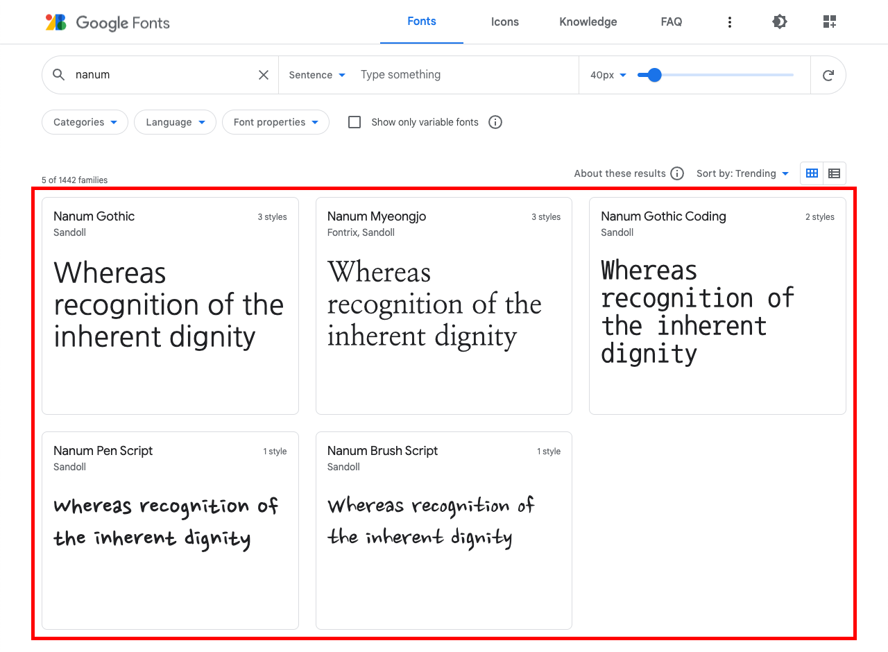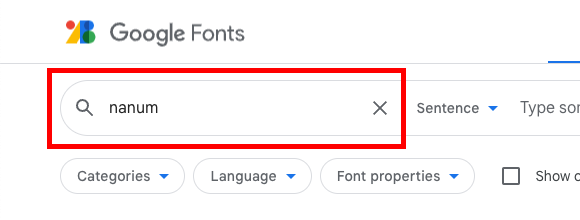 왼쪽 상단의 검색 필드에 원하는 폰트 이름을 영문으로 작성합니다.