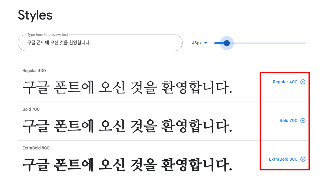 마우스 휠 스크롤을 내려 Style 섹션으로 이동 후, 사용하려는 폰트 스타일을 선택합니다. (복수 선택 가능)