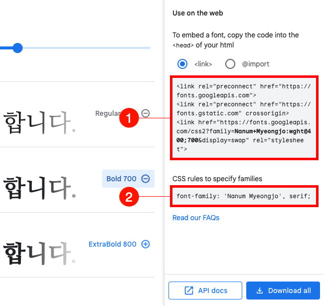 주의: 구글 폰트 사용에는 HTML 및 CSS에 대한 이해가 필요합니다. 또한 제공되는 소스 코드 및 도움말 외 추가적인 기술 및 고객지원은 제공하지 않습니다.