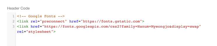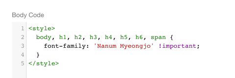 붙여넣은 코드에서 폰트명을 삭제하고, 위 1단계 5번 과정에서 생성한 코드 2번에 표시된 폰트명(예: Nanum Myeongjo)을 입력합니다.