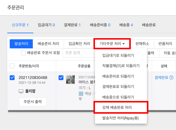 기타 주문처리를 클릭하고, 강제 배송완료 처리를 클릭합니다.