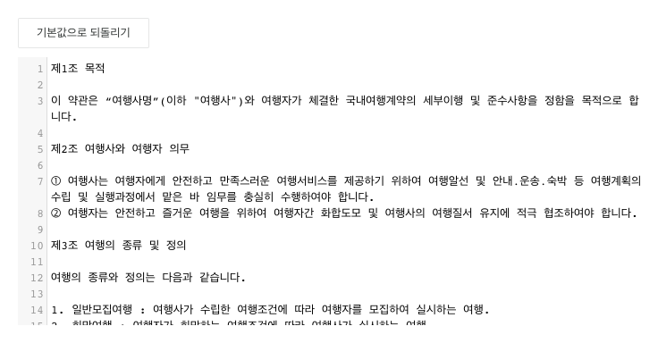 앞서 공정거래위원의 표준여행약관 양식에 따라 필요한 부분을 수정합니다. 만약 직접 작성한 여행약관이 있는 경우 샘플 약관을 삭제하고 추가하시면 됩니다.