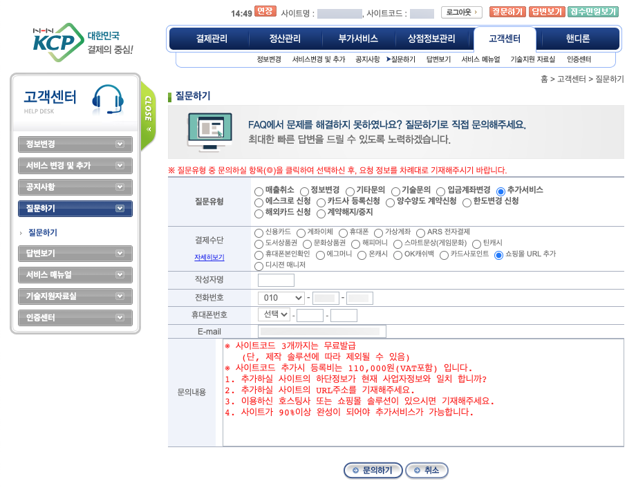 • 문의 내용: 기존  사용했던 KCP를 계속 사용할 것을 알리고, 신청하신 사이트 주소를 기재해 주시면 됩니다.