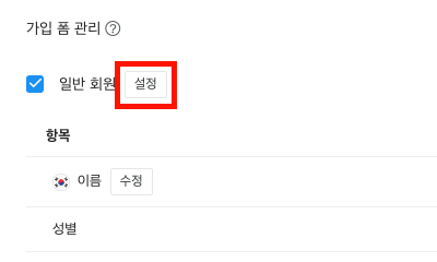 3. 가입 폼 관리 항목에서 유형 이름 오른쪽의 설정 버튼을 클릭합니다.