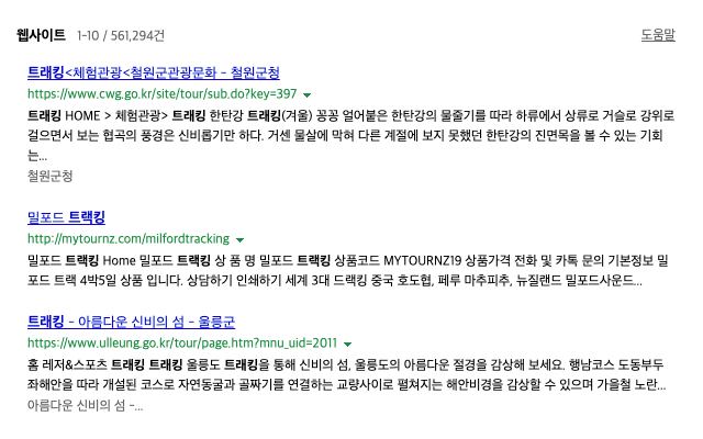 독특하고 고유한 사이트 제목을 사용해 주세요. 예를 들어 사이트 제목이 "트랙킹"인 사이트가 있다고 하겠습니다. "트랙킹"은 전문 등산 기술이나 지식 없이도 산을 즐길 수 있는 일종의 산악여행으로, 이와 관련해서는 이미 수많은 웹 문서(네이버 웹사이트 검색결과 : 56만 건 이상)들이 존재합니다.