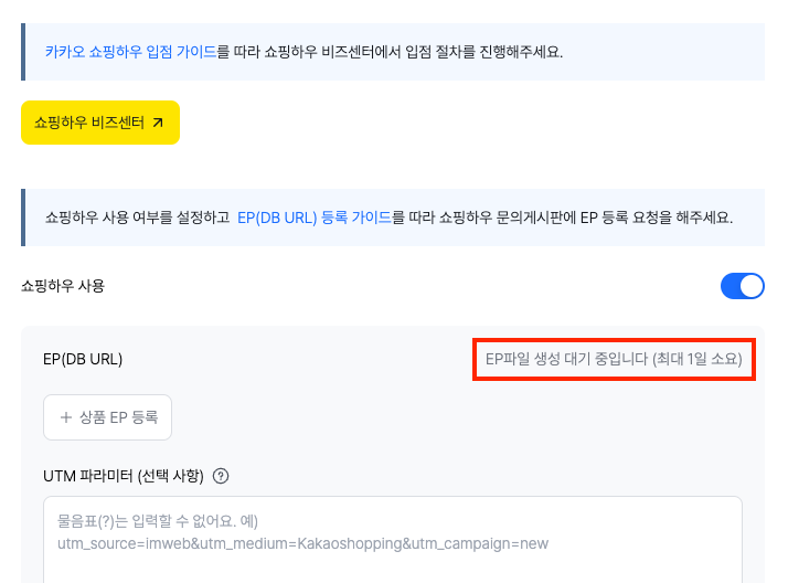 내 캠페이너스 쇼핑몰에서 판매 중인 상품 정보가 담긴 DB URL을 생성하여 카카오 쇼핑하우 비즈센터에 등록하는 과정을 설명합니다.