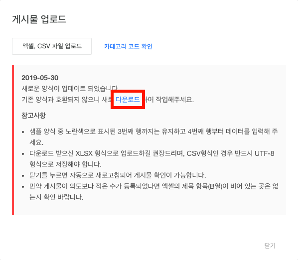 다운로드를 클릭해 양식(파일명 : board_sample.xlsx)을 내려 받습니다.