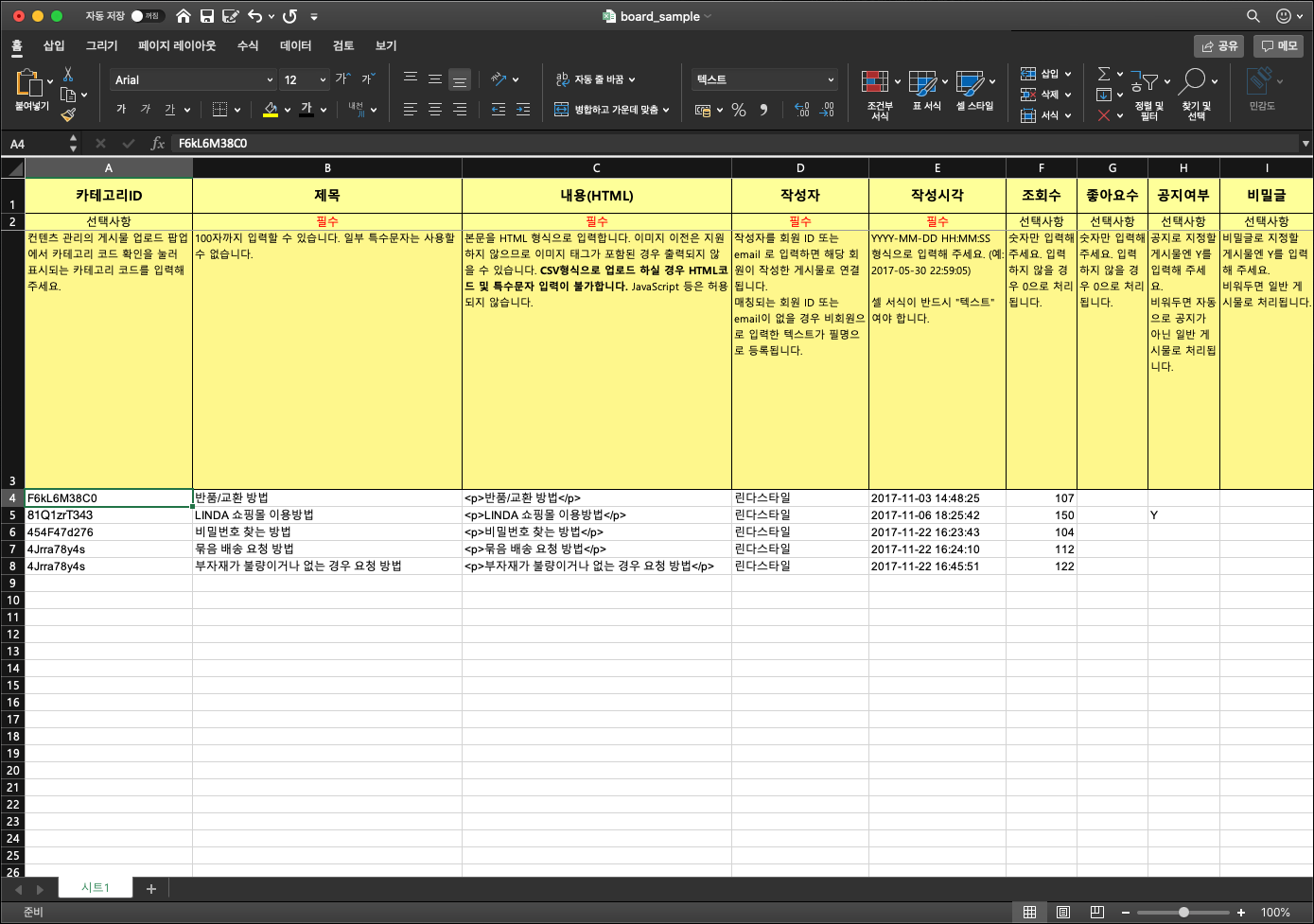 샘플 엑셀 파일 내 주석을 참고해 샘플 게시물 파일을 수정합니다.