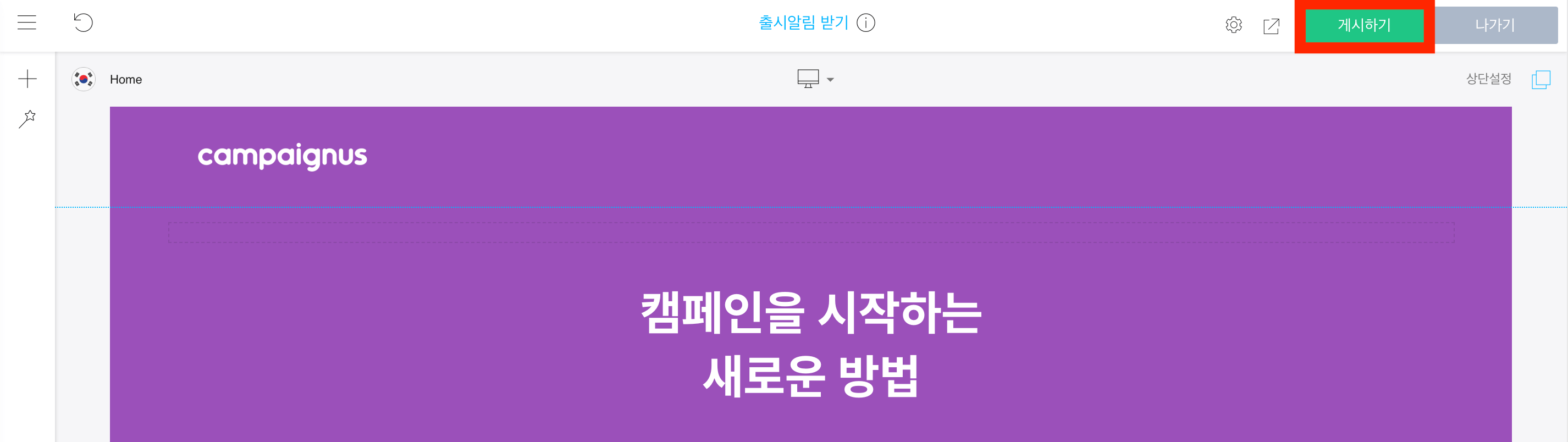 디자인 모드에서 디자인 작업 후 미리보기 또는 내 도메인으로 접속했을 때 디자인한 작업 내용이 보이지 않는다면, [게시하기] 버튼을 누르지 않아 디자인이 반영되지 않은 것입니다.
