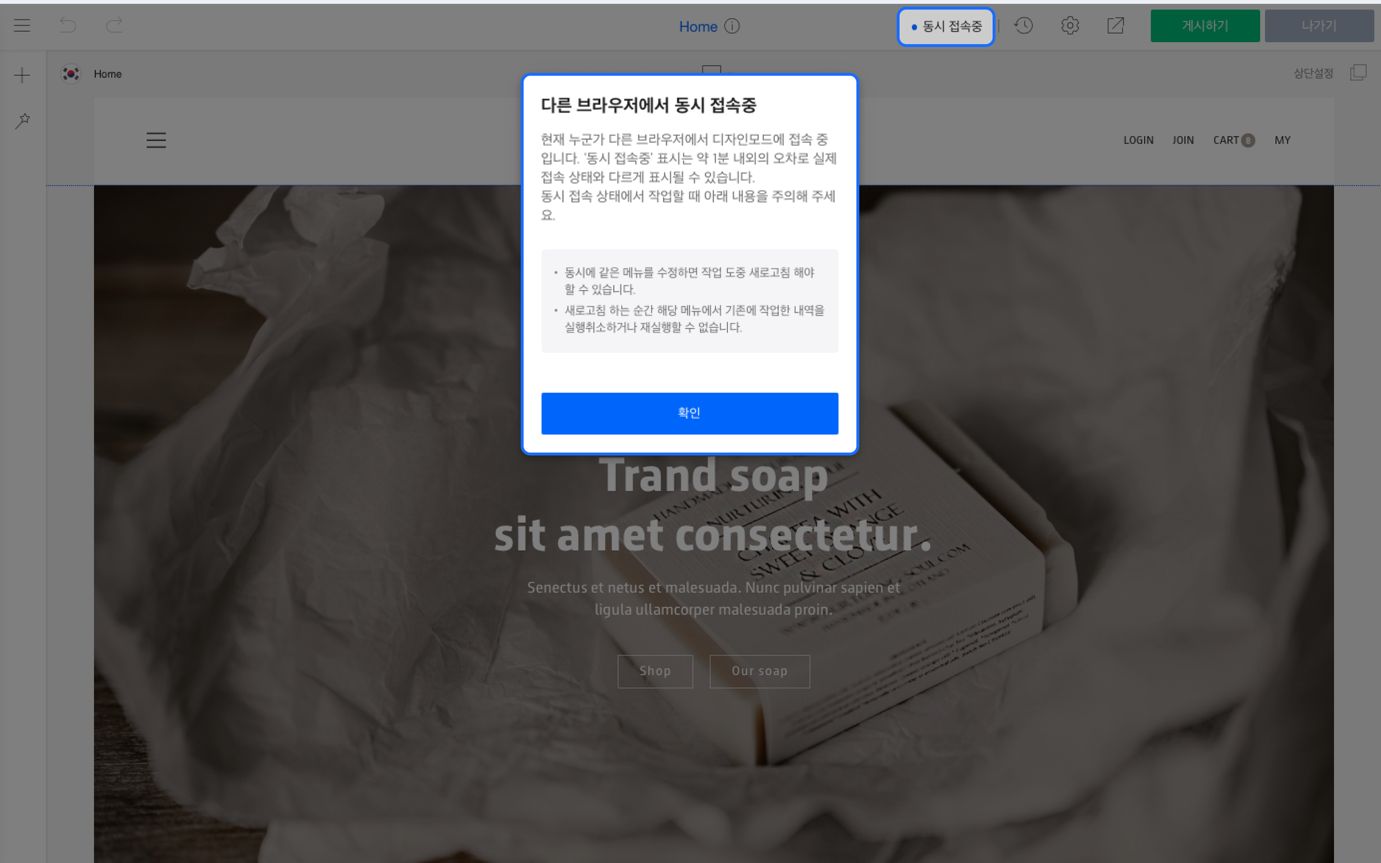 2. 2개 이상의 브라우저에서 디자인 모드를 동시 접속할 경우, '동시 접속중' 문구가 노출돼요.