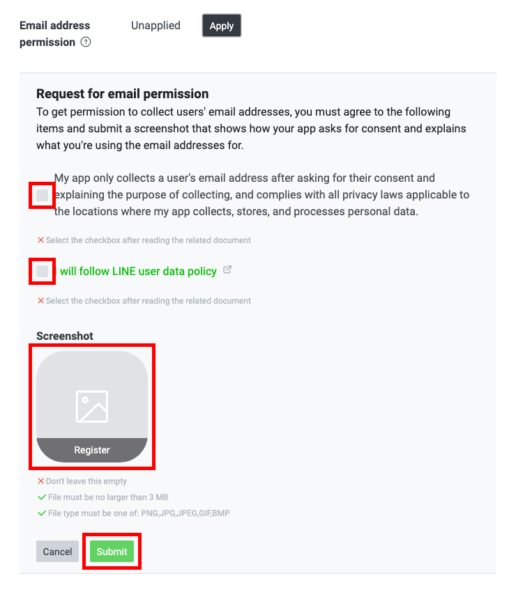 Request for email permission(이메일 권한 요청) 항목에 모두 동의하고, 내 사이트의 약관동의(이메일 주소 수집 목적과 동의 요청) 화면을 캡쳐하여 Screenshot에 올려줍니다.