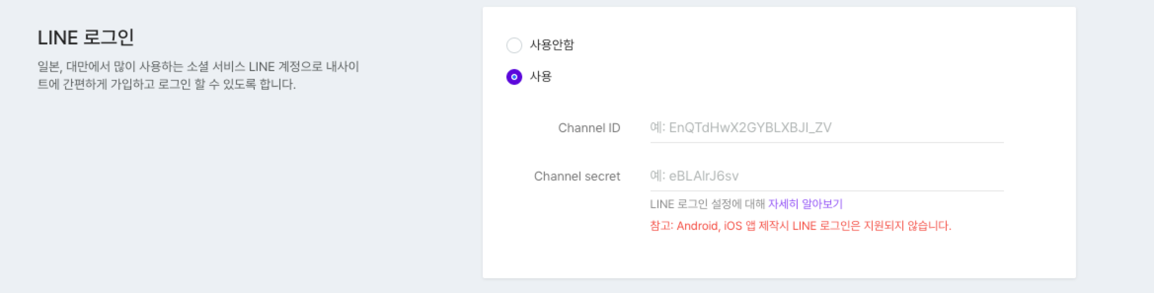 LINE 로그인 항목에서 사용 여부를 on 으로 설정하신 뒤, 위 1~2번 과정에서 복사한 Channel ID 와 Channel secret 값을 각 항목에 맞게 붙여넣습니다.