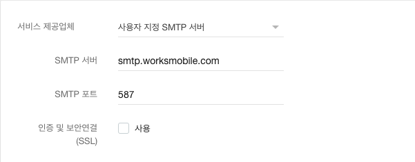 아래의 그림과 설명을 참고해 네이버웍스 사용자 지정 SMTP 정보를 설정합니다.