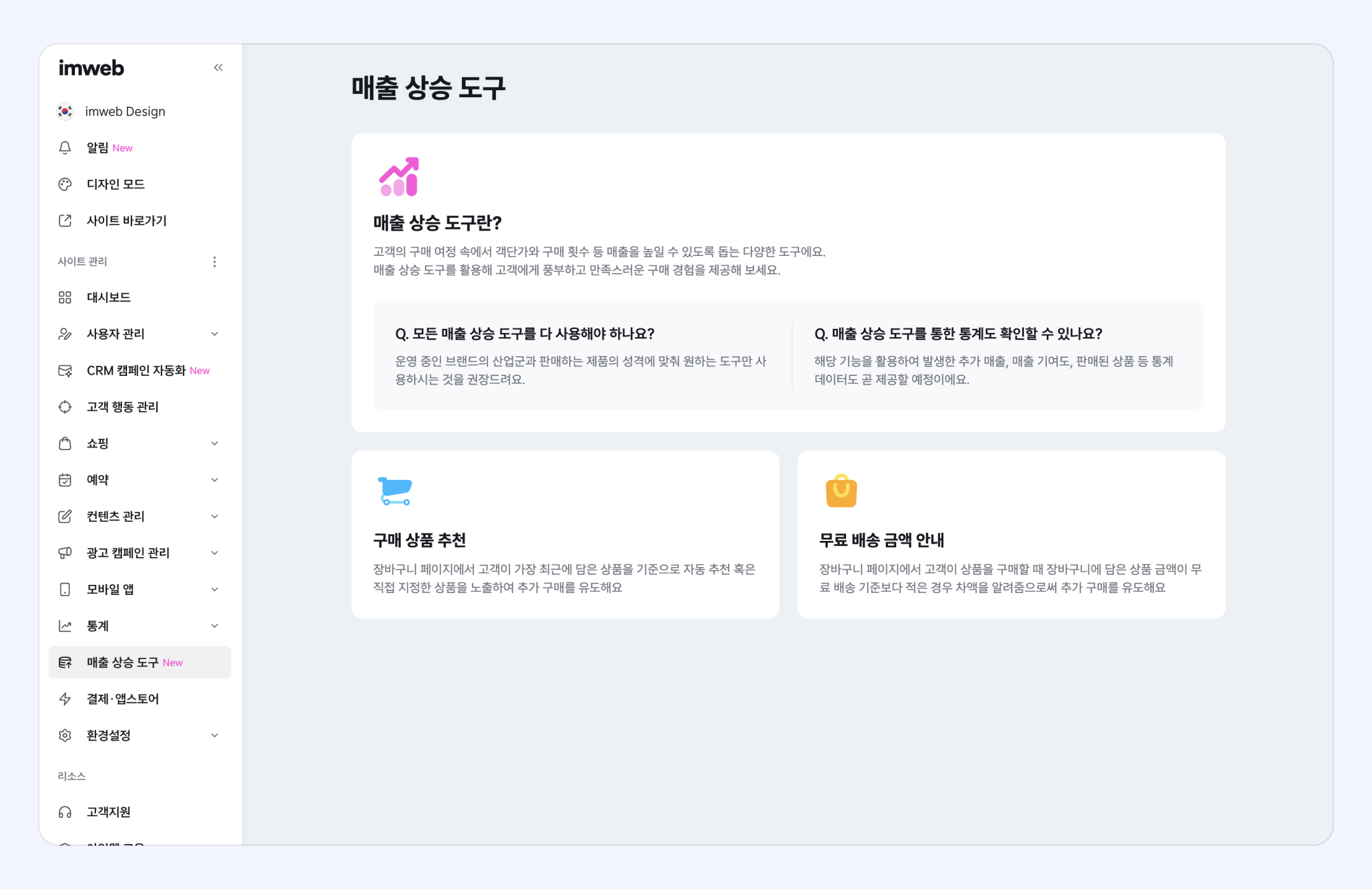 [관리자 페이지] > [매출 상승 도구] 메뉴에 접속해 주세요.