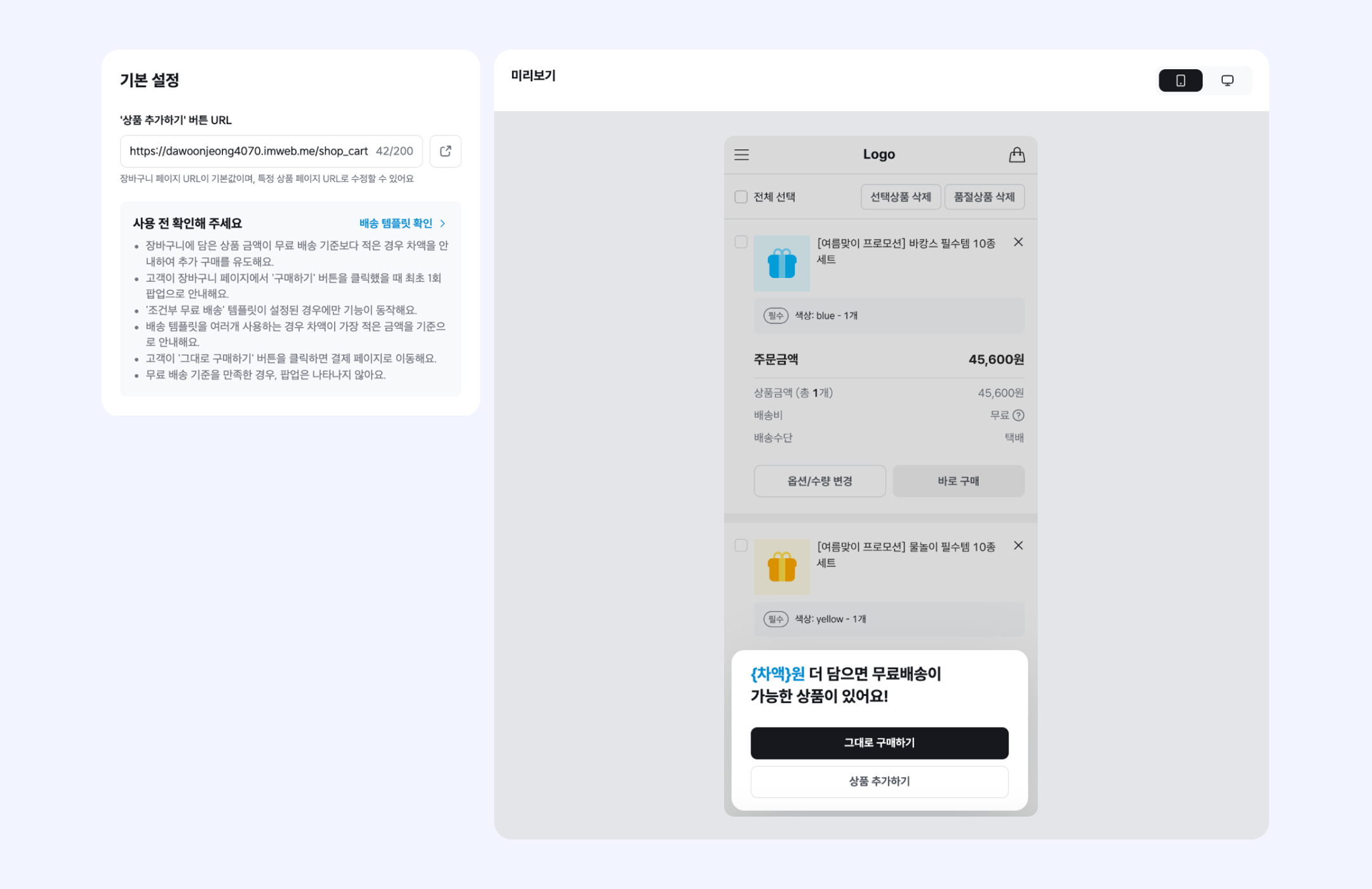 '상품 추가하기' 버튼에는 장바구니 페이지가 기본으로 설정되어 있으나, 원한다면 특정 상품 페이지 URL로 수정할 수 있어요.