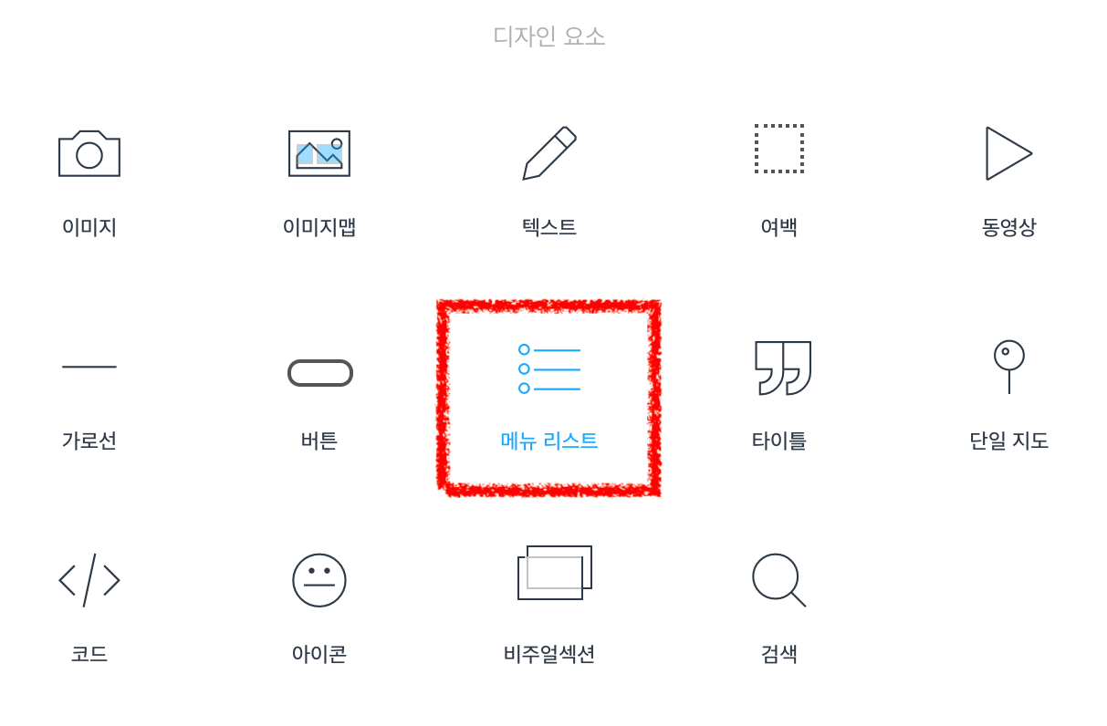 섹션 위에 나타나는 +아이콘을 클릭하거나 디자인 모드 왼쪽 윗부분의 + 아이콘을 눌러 메뉴리스트 위젯을 추가합니다.