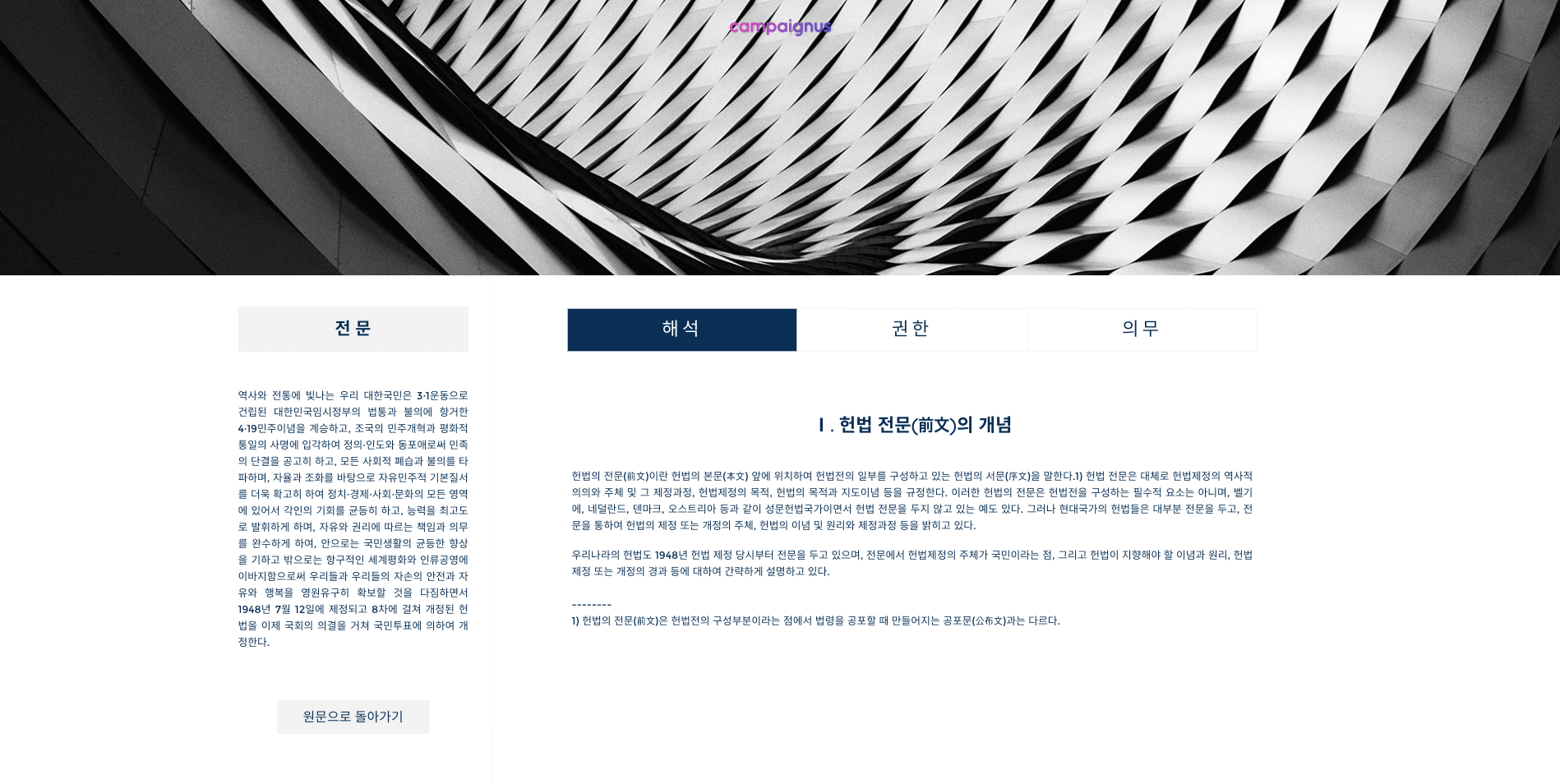 기능 미리보기1) 메뉴리스트 이용 예시 보기에 접속하여, 페이지 가운데에 있는 [해석], [권한], [의무] 버튼을 눌러보세요.2) 페이지 디자인의 대부분은 그대로 있고, [해석], [권한], [의무]의 내용만 바뀌는 것을 확인할 수 있습니다.