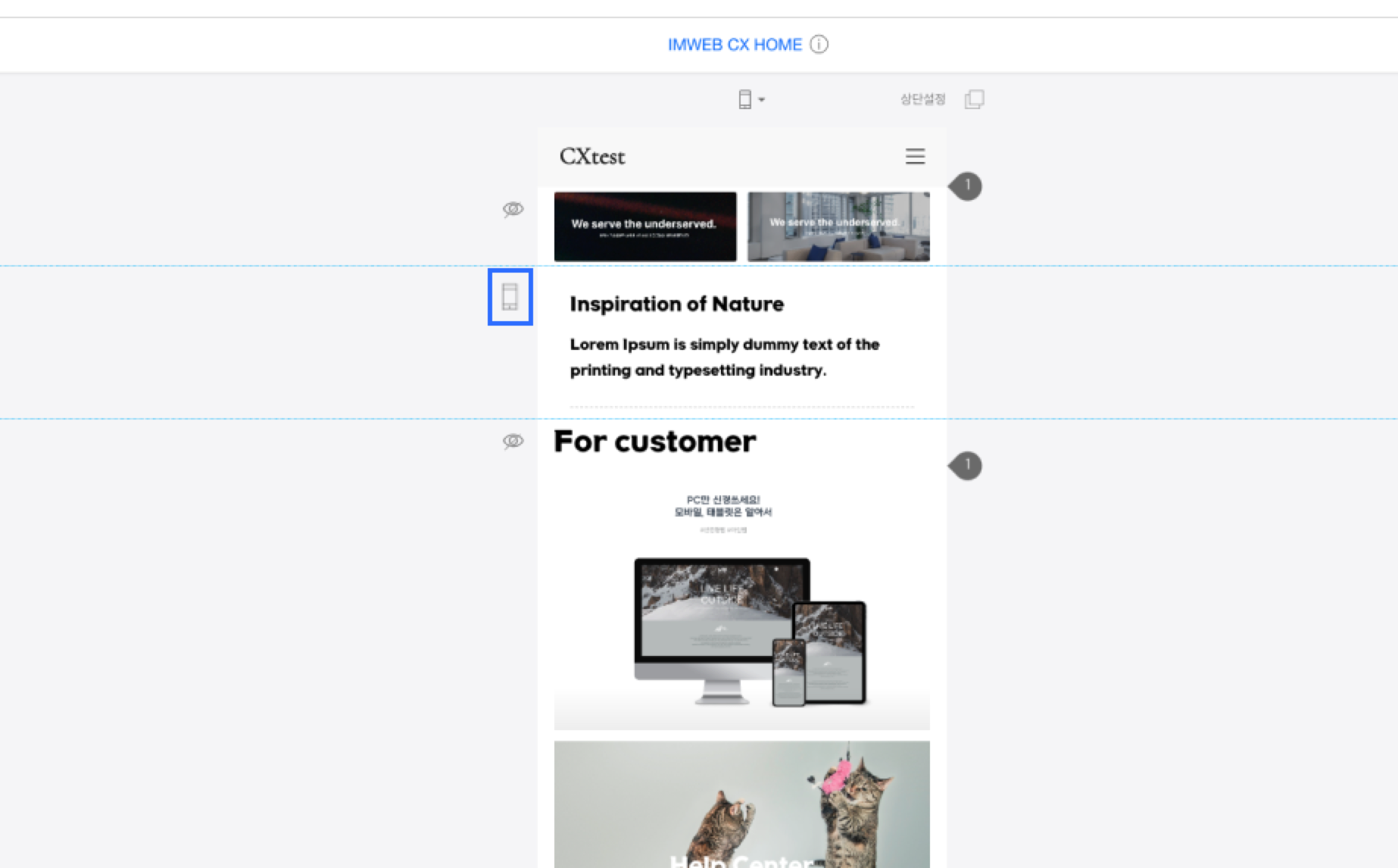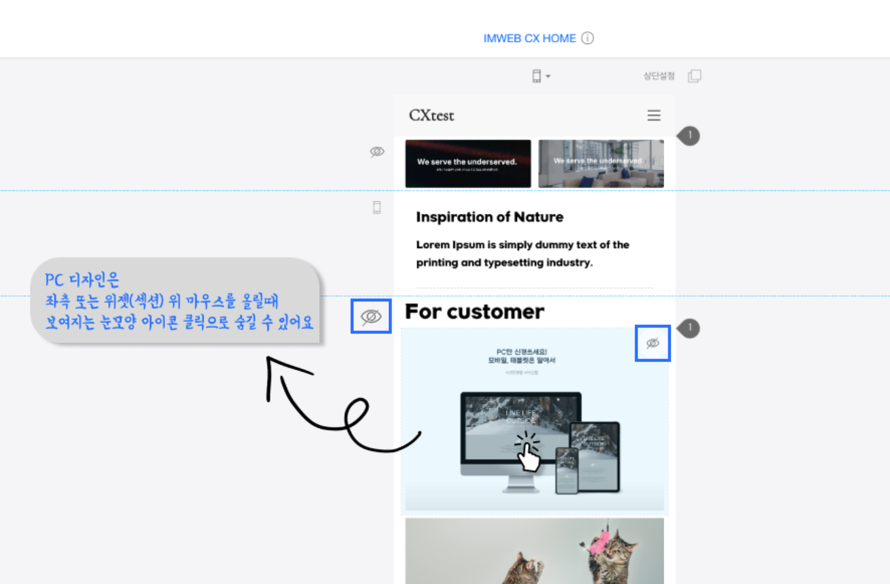 아래 이미지 표시처럼 눈 모양 아이콘이 보인다면, 이 섹션은 ‘PC 디자인이 자동으로 반영된 부분’이에요. 모바일에서는 보여주고 싶지 않다면 눈 모양 아이콘을 클릭해서 숨겨볼 수 있어요.