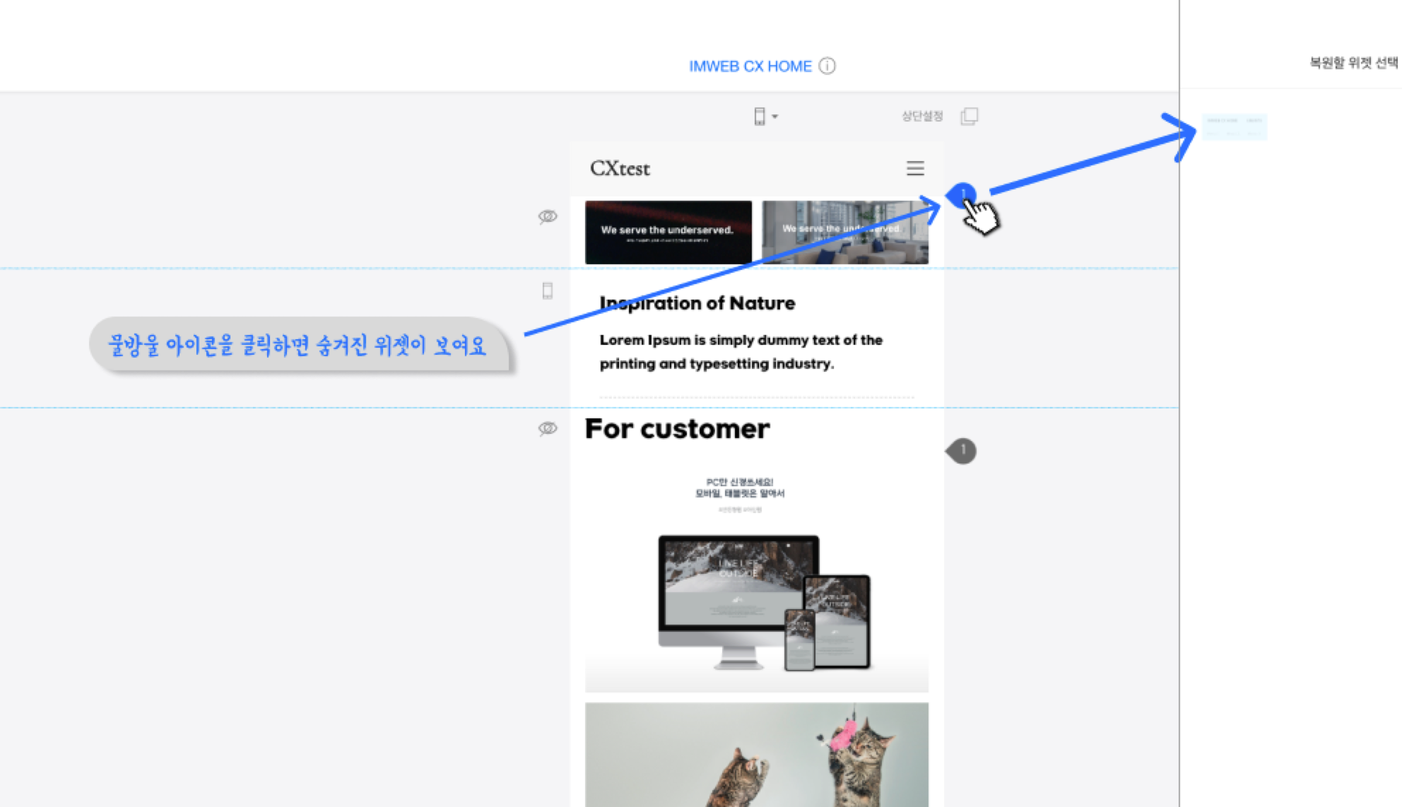 다시 모바일에 보여주고 싶다면 우측 물방울 모양을 클릭해서 숨김 처리한 디자인을 복원해 주세요!