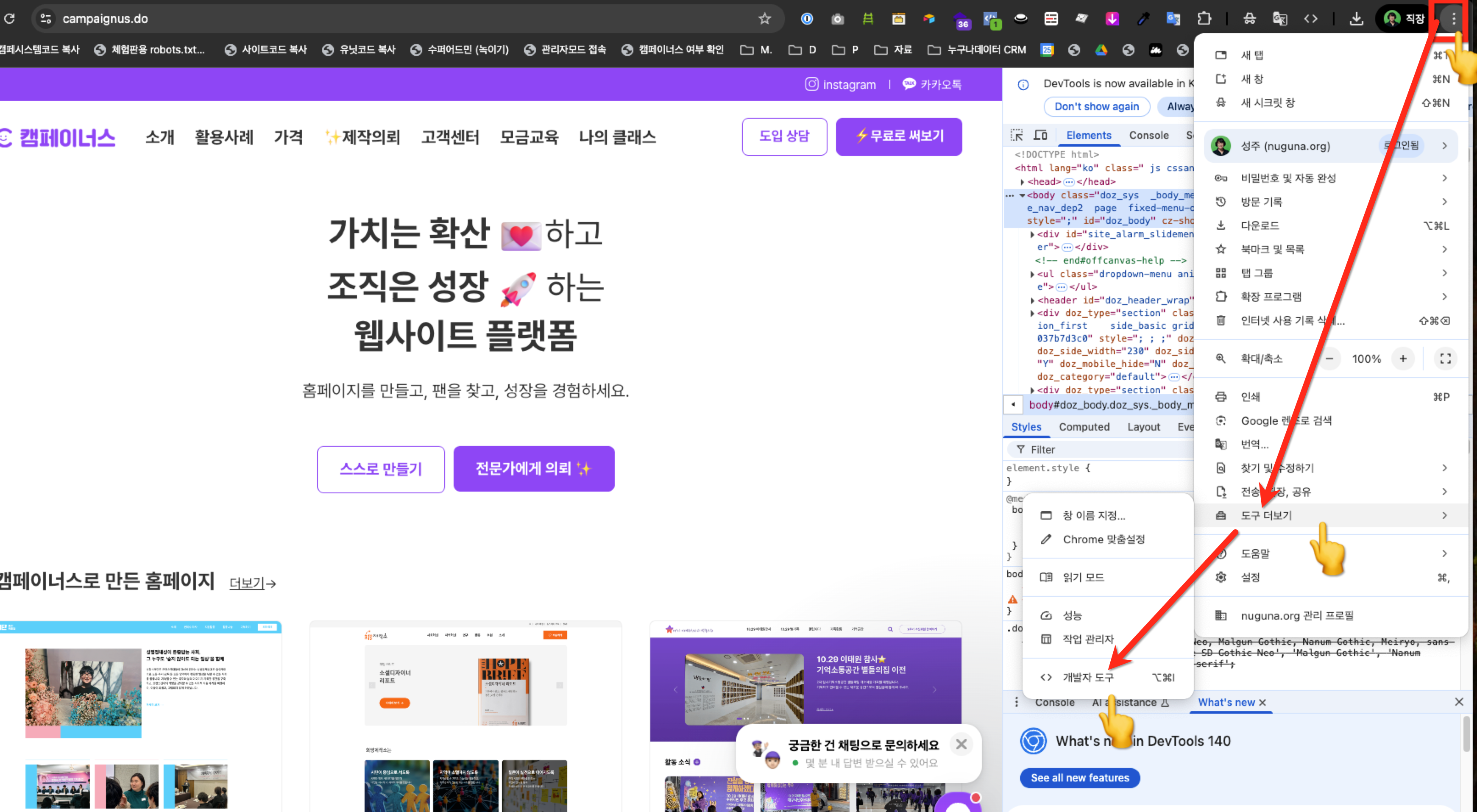 1. [Chrome(크롬) 브라우저 우측 상단 ‘더보기’버튼 클릭 > 도구 더보기 > 개발자 도구]를 클릭, 또는 키보드 F12 버튼을 눌러 개발자 도구에 접속해 주세요.2