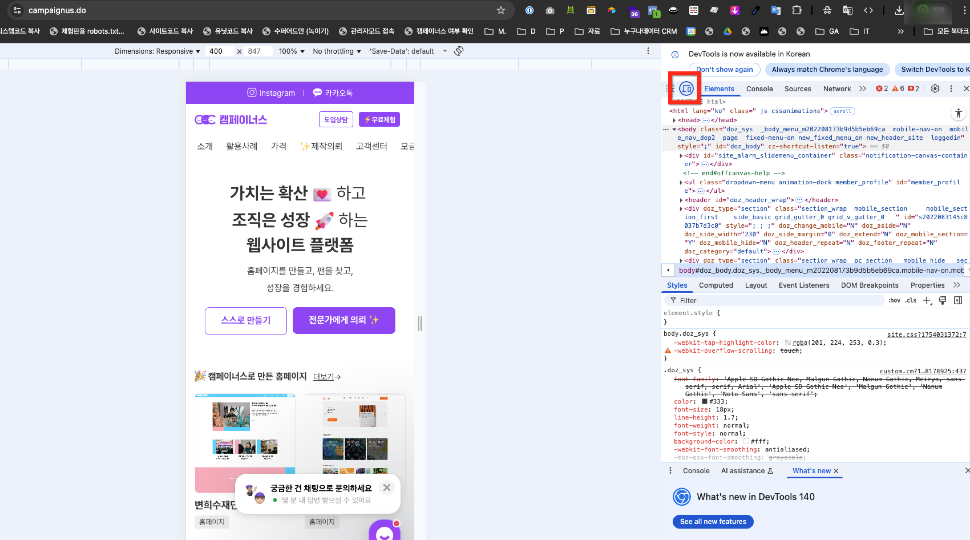 2. 개발자 도구 왼쪽 상단의 기기(장치) 아이콘을 클릭해 주세요.