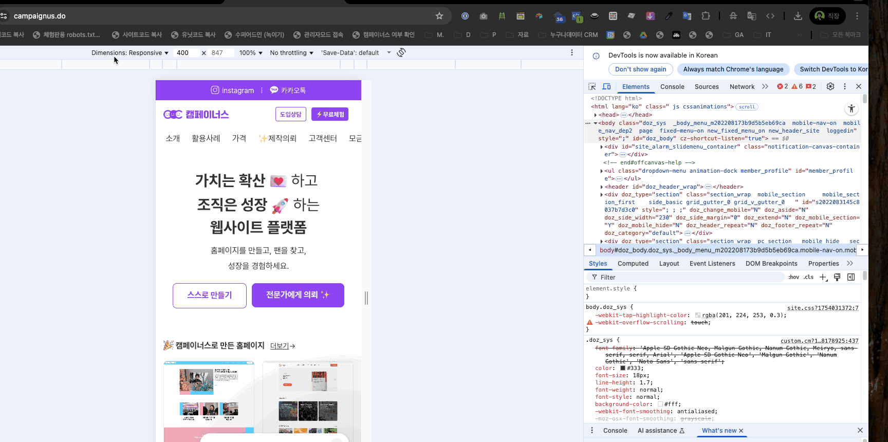 PC에서 모바일 디자인 화면을 확인할 수 있는 방법 2가지를 소개해 드릴게요! 이 방법은 화면을 모바일 크기에 맞춰서 ‘디자인’을 확인하는 방법이에요. 모바일 기능을 모두 확인하기는 어려운 점 참고해 주세요.