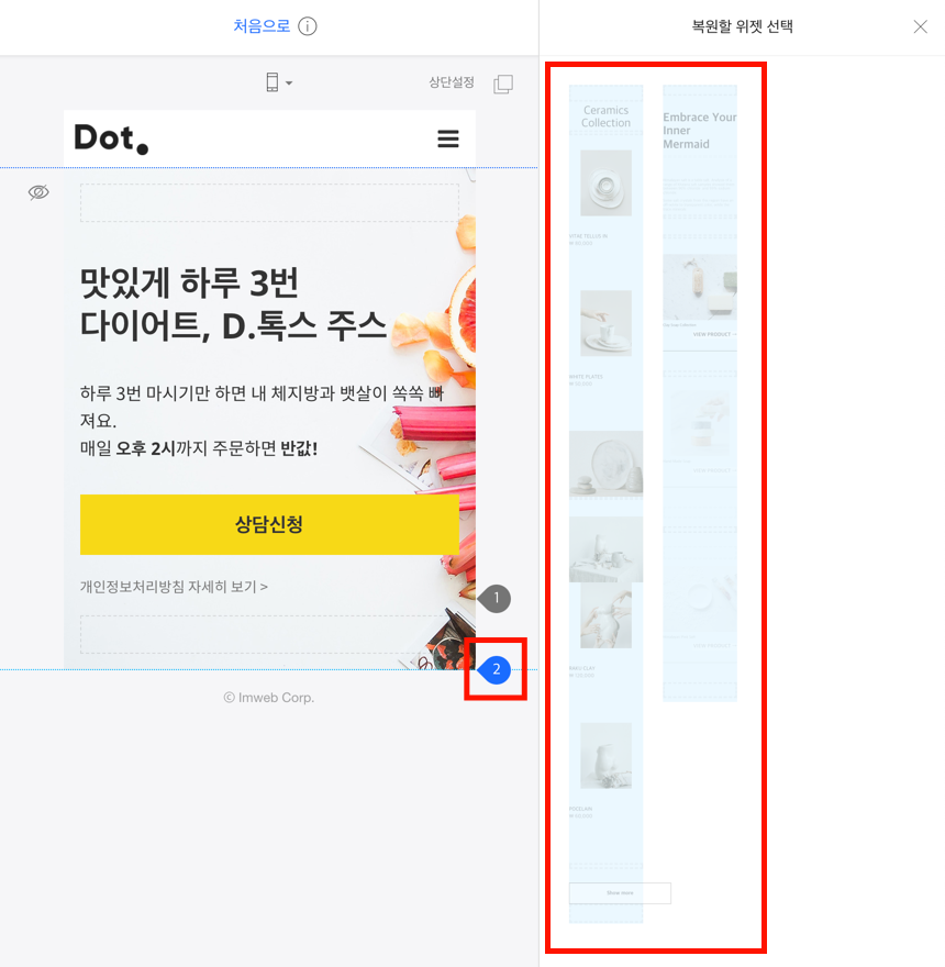 화면 오른쪽에 숨긴 섹션 목록창이 나타나면 복원하려는 섹션을 클릭합니다.