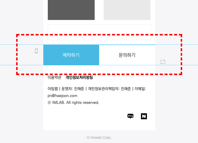 모바일 전용 섹션에 위젯을 추가하여, 섹션을 디자인합니다. 텍스트 위젯, 이미지 위젯 등을 사용해 방문예약, 전화연결 등의 버튼을 추가할 수 있습니다.