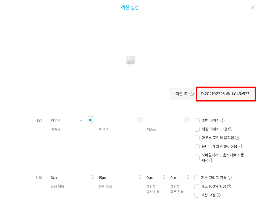 섹션 설정 창의 오른쪽에 위치한 섹션 ID를 마우스로 드래그하여 복사합니다.