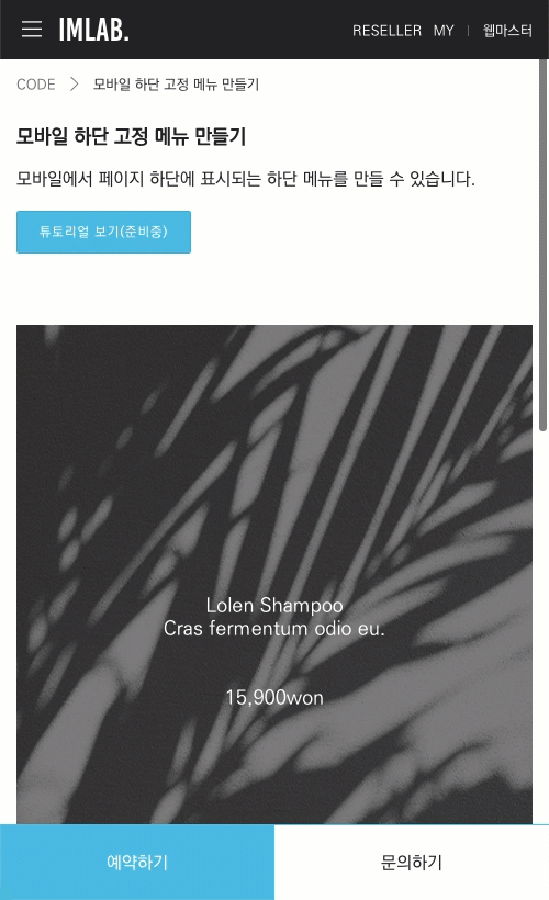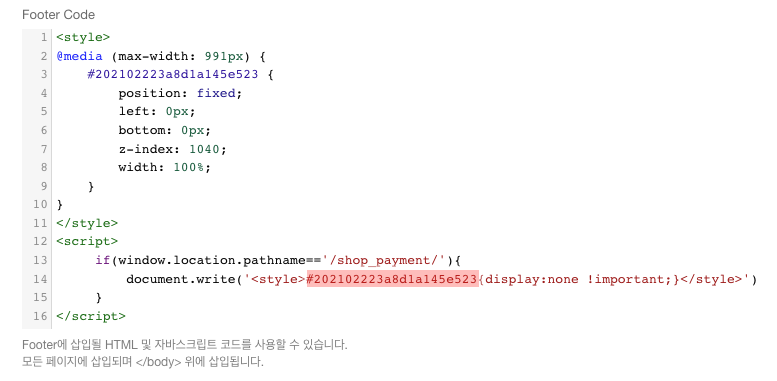 쇼핑 기능을 사용할 경우 결제하기 페이지에서 모바일 하단 고정 메뉴가 표시되지 않도록 감출 수 있습니다.