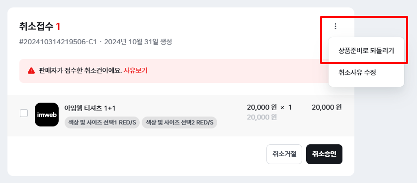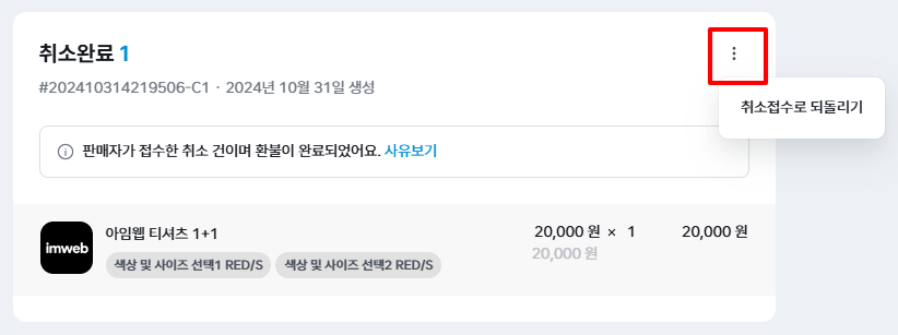 주문 상세페이지에서 '취소 완료' 섹션 상단의 더보기(...) 버튼을 클릭하여 '취소 접수' 상태로 변경해 주세요.