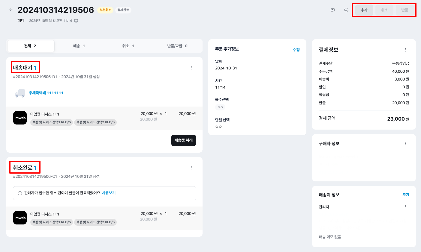 참고: 취소 접수 상태로 변경하면 결제정보에 '결제 요청'과 '수동 입금 확인' 버튼이 노출될 수 있어요. 미입금 결제 건을 취소 접수만 한 상태이기에 입금이 되지 않아 노출되는 부분으나 상품 준비 상태까지 변경하신 후 진행하실 것을 권장 드립니다.