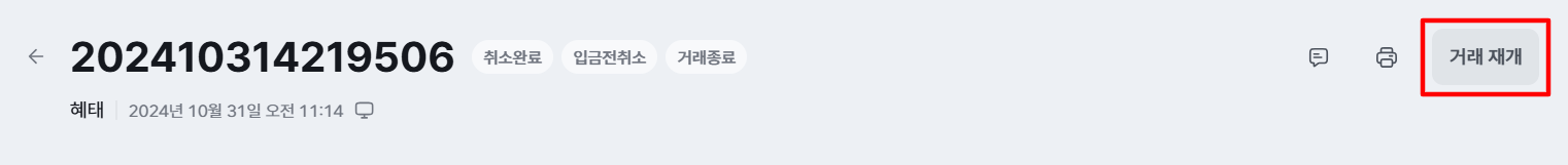 참고: 입금 전 취소 건은 취소 접수 시 바로 취소 완료 상태가 되며 환불 할 금액 또한 없기에 '거래 종료' 처리 됩니다. 그렇기에 거래 재개를 통해 주문 처리가 가능한 상태로 변경하는 과정이에요.