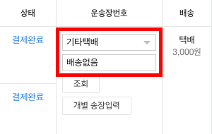 송장번호: 향후 구분을 위해 송장번호에는 "배송없음"을 입력합니다.