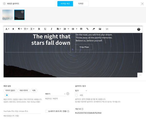비주얼섹션을 클릭하고, 비주얼섹션을 꾸며줍니다. 비주얼섹션 활용방법