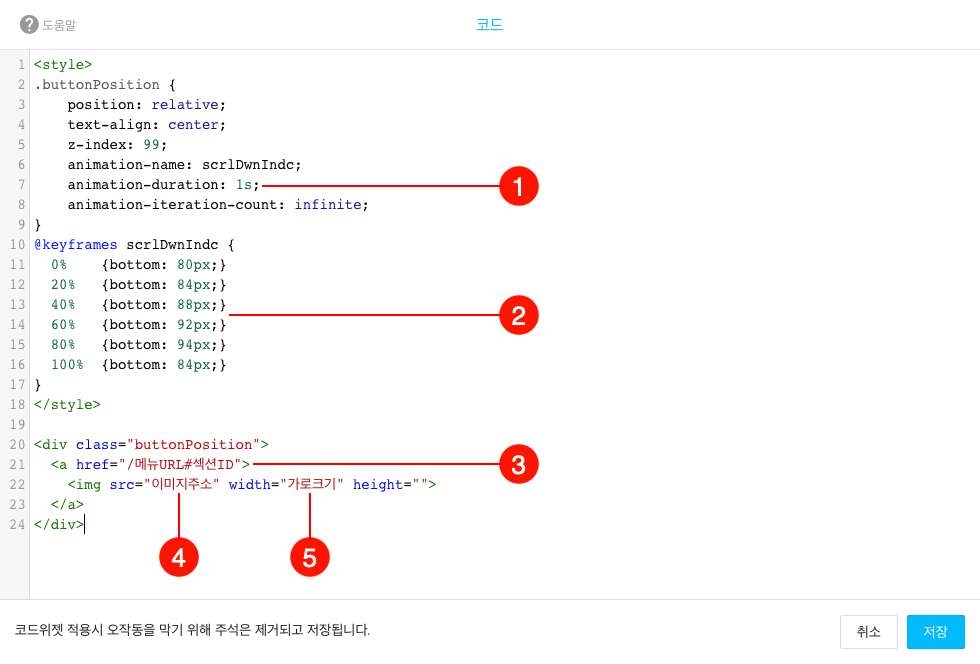수정을 완료하면 코드 설정 창 오른쪽 하단의 저장 버튼을 클릭해 적용합니다.
